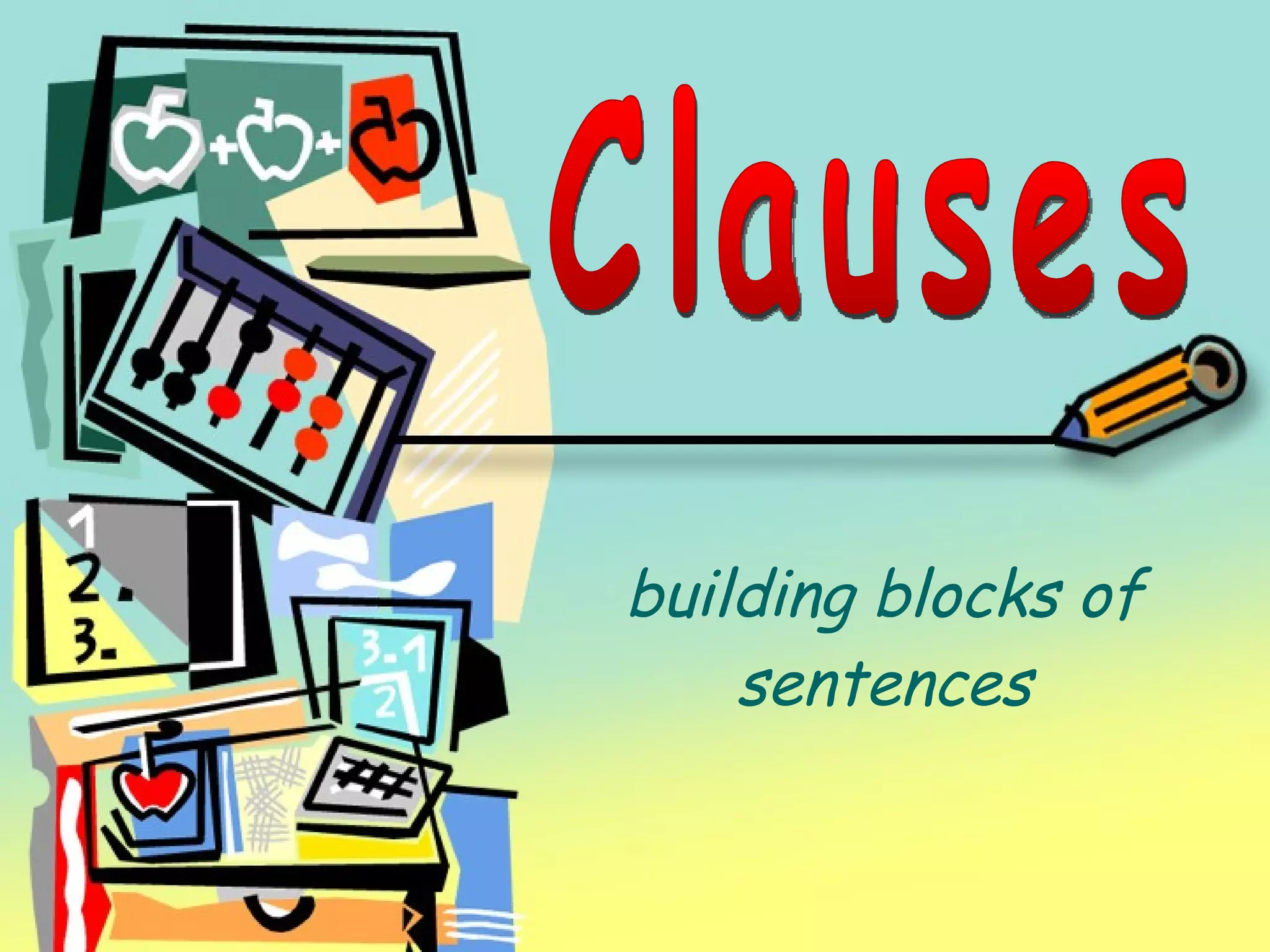 The document discusses the different types of clauses that can be used in sentences, including independent clauses, dependent clauses, noun clauses, adjective clauses, and adverb clauses. It provides examples and explanations of each clause type, how they are used, and how clauses can be connected to form complete sentences. Understanding clauses is important for avoiding errors like fragments and run-ons and for becoming a stronger writer.