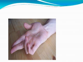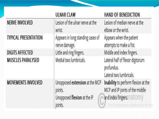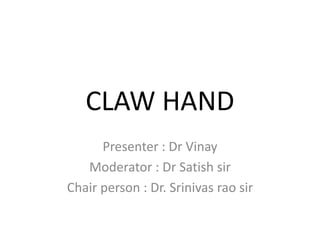 There are several types of claw hand including partial and total. Partial is due to ulnar nerve paralysis and results in clawing of just the ring and little fingers. Total claw hand is caused by combined median and ulnar nerve palsies and leads to clawing of all five fingers.