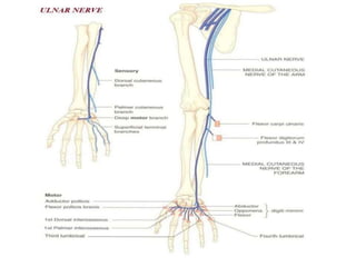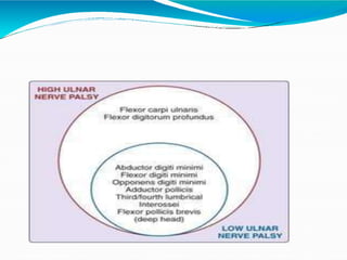 Various tests can identify which nerves are involved based on the muscles affected. Ulnar nerve tests examine muscles like the first dorsal interossei and hypothenar muscles.