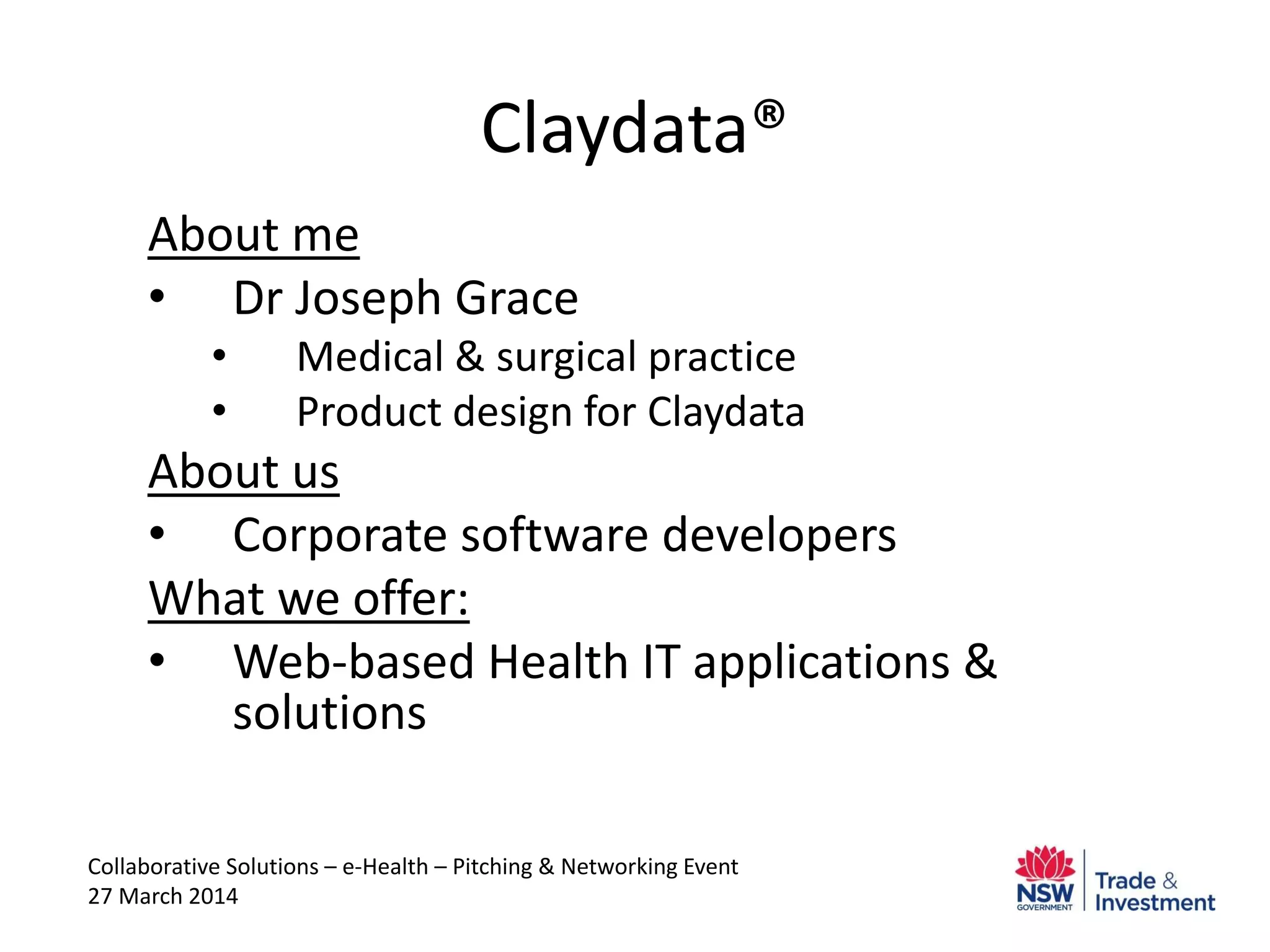 Dr. Joseph Grace and Claydata are developing a web-based health IT solution called Putty to address common problems with existing eHealth options. Putty is designed to be simple, user-friendly, interoperable across platforms, and delivered through a cost-effective LAMP stack web and cloud architecture. Claydata aims to have Putty in prototype and testing by April 2014, in beta by June 2014, and publicly released by September 2014, serving hospitals, clinics, and other healthcare providers as well as patients.