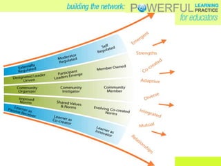 This document discusses 21st century learning and the importance of connected learning communities. It defines key concepts like personal learning networks, communities of practice, and professional learning communities. It emphasizes that effective professional development now involves actively making connections locally, globally, and through one's own network. Learning is seen as a social process of sharing, collaborating, and building knowledge together through open participation and interaction online.