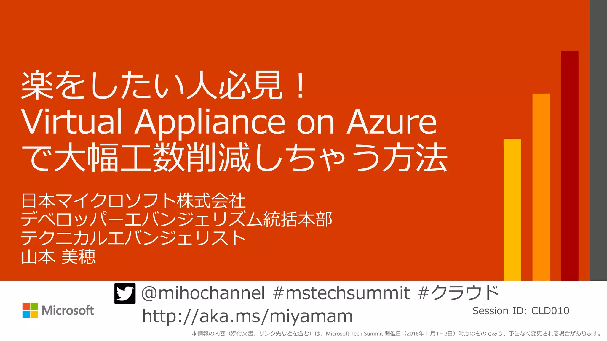 #mstechsummit #クラウド http://aka.ms/miyamam 本情報の内容(添付文書、リンク先などを含む)は、Microsoft Tech Summit 開催日(2016年11月1-2日)時点のものであり、予告なく変更される場合があります。