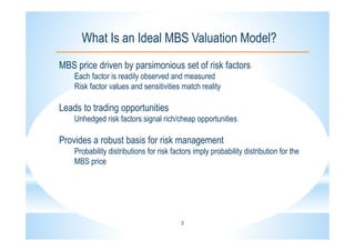 This document describes the CLEANTM model for valuing mortgage-backed securities (MBS). The CLEANTM model treats mortgages as callable amortizing bonds and models prepayments by dividing mortgage pools into buckets based on borrower behavior. The key risk factors in the model are interest rates, volatility, and homeowner credit spreads. The model calibrates quickly and intuitively based on observable market data. It provides realistic valuations, risk measurements, and trading opportunities without the limitations of other prepayment models.