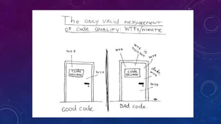 This document summarizes key principles for writing clean code as outlined in the book "Clean Code" by Robert C. Martin. It discusses ideas like writing code that is easy to read and understand through use of meaningful names, small functions that do one thing well, and avoiding duplication. It also covers principles for object-oriented design like encapsulation, organization for change, and separation of concerns. Testing philosophies like test-driven development and ensuring tests are fast, independent, repeatable, self-validating, and timely are also emphasized. The overall message is that writing clean code requires attention to structure, naming, formatting and testing to produce software that is simple, well-organized and a pleasure to maintain.