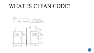 The document provides guidelines for writing clean code with meaningful names, functions, comments, formatting, and error handling. Some key points include: using intention-revealing names, avoiding encodings or abbreviations, keeping functions small and focused, extracting try/catch blocks, preferring exceptions over return codes, writing informative comments, and ensuring good formatting with consistent indentation and vertical spacing.