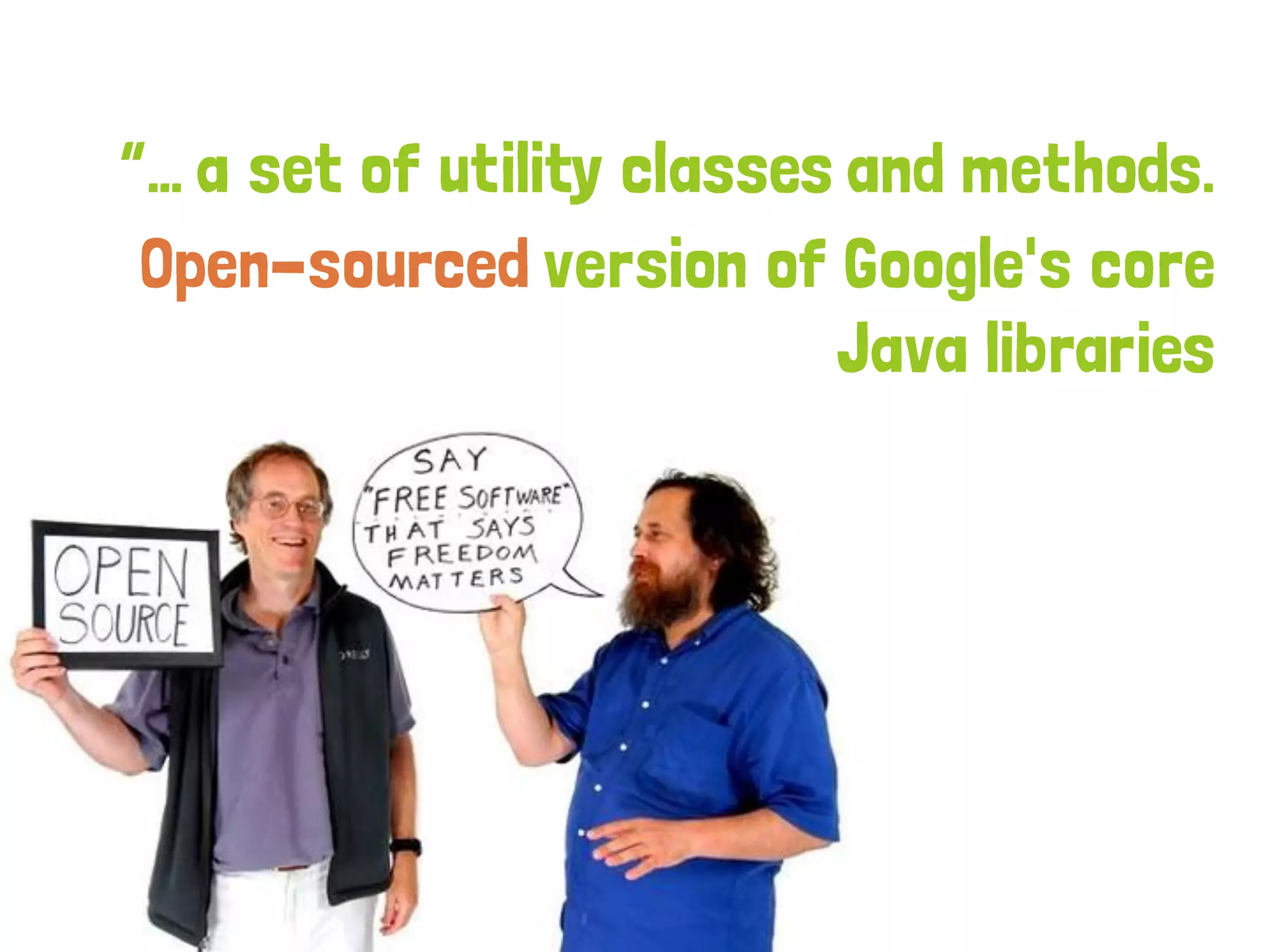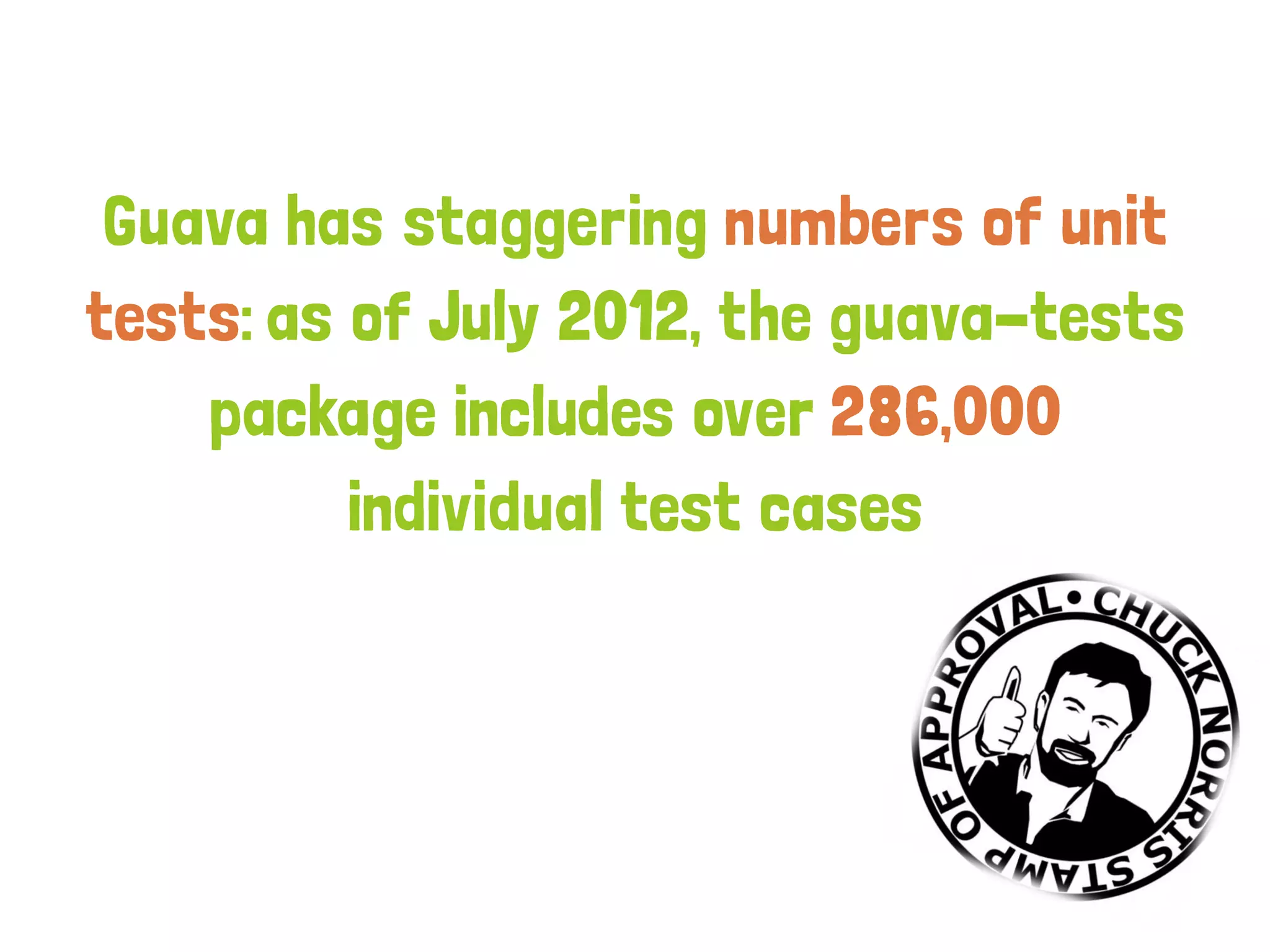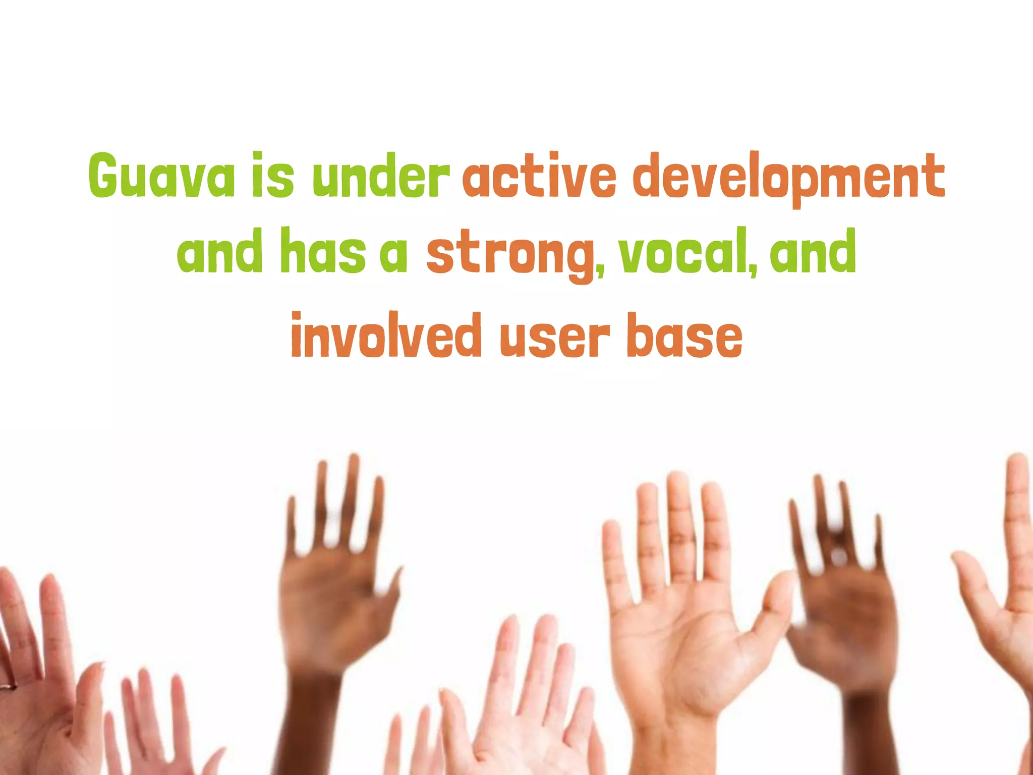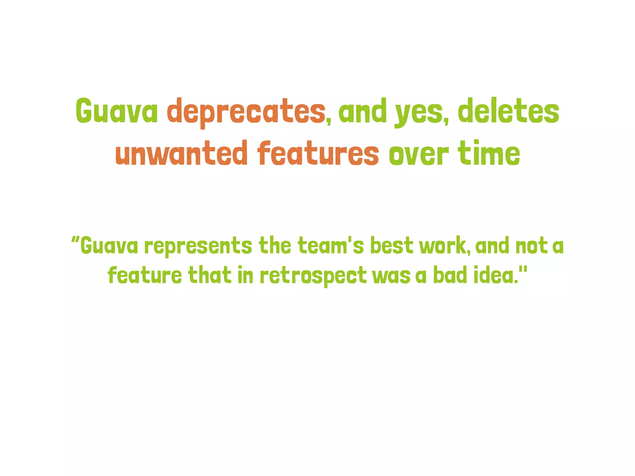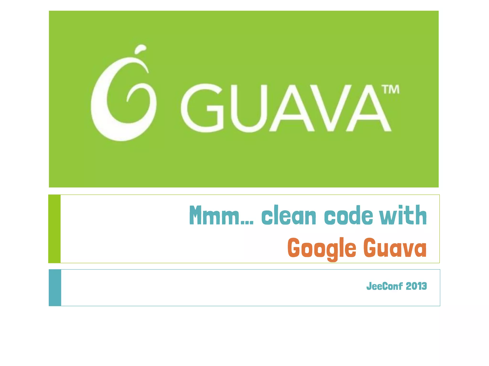 The document discusses Google Guava, a library for Java that aims to reduce code complexity and improve productivity by providing various utilities such as annotations, collections, and concurrency tools. It emphasizes the importance of Guava for developers to write cleaner code, highlights the functionality of its utilities for string manipulation, null handling, and functional programming practices, and introduces concepts like Optional, Predicate, and Cache. The presentation also showcases practical examples of how to use these features to enhance Java development.