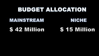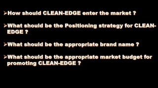 This document contains a case study analyzing market segments and profit forecasts for a company, Clean Edge, entering the razor and cartridge market. It includes a market segmentation breakdown by value and sales. Profit and loss forecasts are provided under niche and mainstream scenarios. Two executives debate whether Clean Edge should target the niche or mainstream market. The niche strategy appeals to minorities and has lower risks but may not scale, while the mainstream approach could broaden appeal but risks cannibalizing existing brands and requires more investment. In the end, Clean Edge must decide whether to launch a new niche brand or reposition their existing Paramount brand to target the mainstream market.