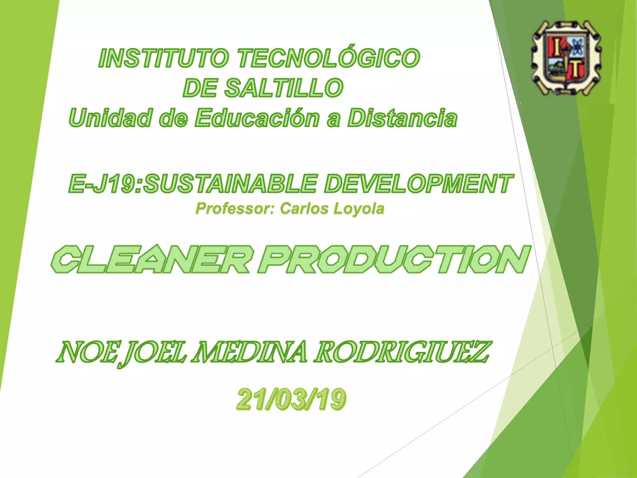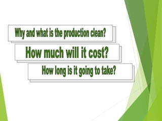 Cleaner Production is a strategy for environmental and business management that aims to efficiently use raw materials and reduce emissions, waste, and risks to human health and the environment. It seeks to encourage cleaner production in industries through developing regulatory frameworks and providing technical and financial support for cleaner production implementation. The goals are to increase resource efficiency, reduce costs and risks, and improve competitiveness for businesses.