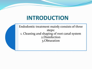 The document discusses various techniques for cleaning and shaping the root canal system during endodontic treatment. It describes the objectives and basic principles of root canal preparation, including removing debris and maintaining the original shape of the canal. Several techniques are summarized, such as step-back, crown-down, balanced force, and ultrasonic instrumentation. For each technique, the document outlines the steps and discusses advantages and disadvantages.