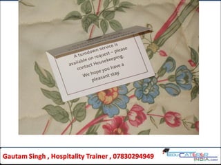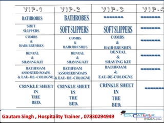 The document outlines cleaning procedures and frequency schedules for hotel housekeeping, covering routines for cleaning guest rooms, public areas, and VIP accommodations. It details the standard operating procedures (SOP) for tasks such as cleaning, dusting, bed making, and managing guest belongings, alongside the significance of deep cleaning and safety measures in public spaces. Additionally, it categorizes VIP guests and describes the special amenities and services provided to enhance their experience.