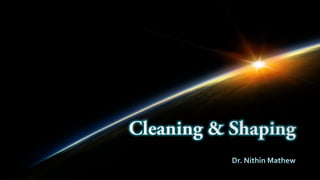 The document provides an overview of root canal instrumentation techniques and guidelines. It discusses the history of instrumentation, Schilder's objectives, principles of cleaning and shaping, variations in canal morphology like curved canals, C-shaped canals and isthmuses. It also describes functional motions used in instrumentation like reaming, filing, watch-winding and anticurvature filing. Finally, it classifies endodontic instruments into groups based on operation - hand, low-speed, engine-driven and ultrasonic/sonic.