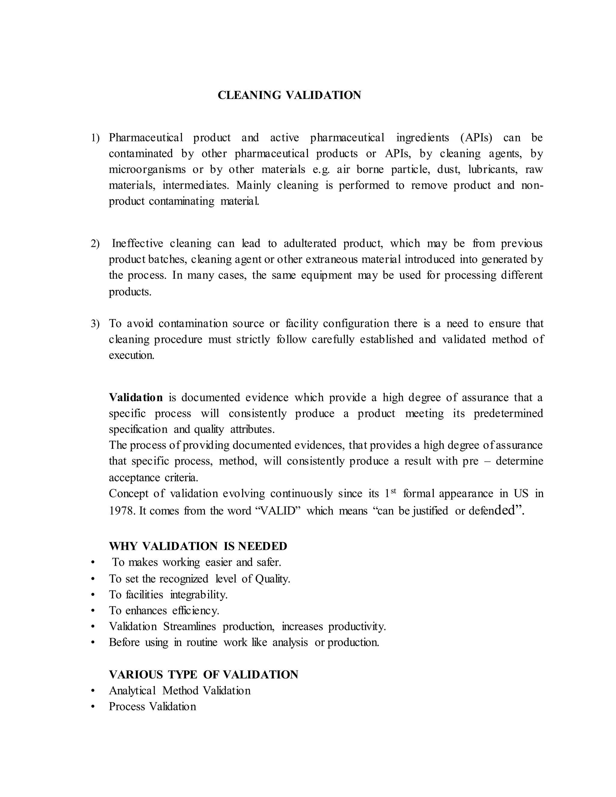 Cleaning validation is important to ensure pharmaceutical equipment is properly cleaned between product batches to prevent contamination. It involves characterizing equipment to identify difficult to clean areas for sampling, selecting validated cleaning agents and methods, and using techniques like swab or rinse sampling of critical sites to test that cleaning meets predefined acceptance limits. Validation provides assurance that specific cleaning processes consistently produce acceptable levels of cleanliness.