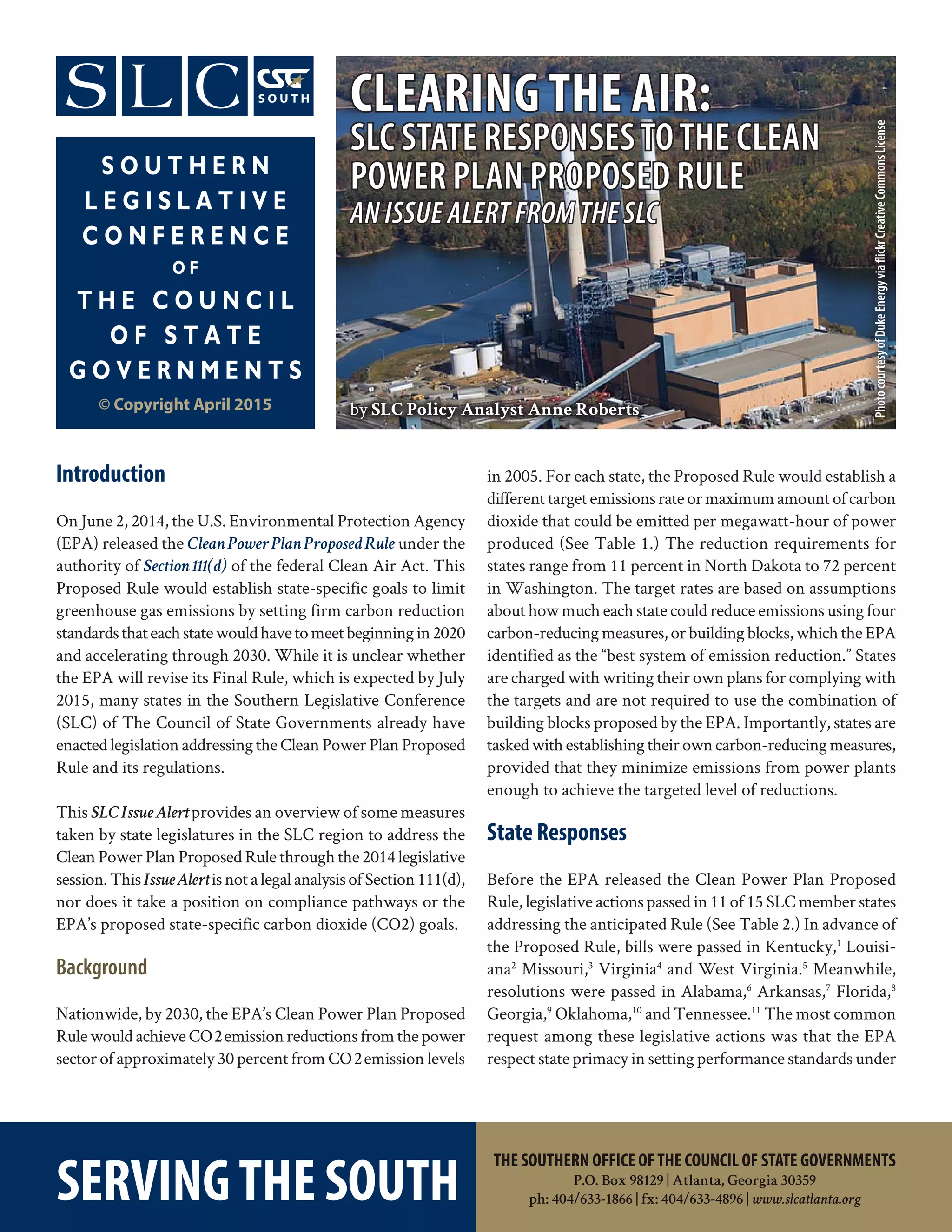This document provides an overview of legislative actions taken by 11 Southern states in response to the proposed EPA Clean Power Plan rules. Many states passed resolutions requesting that EPA give states primacy and flexibility in setting their own carbon emission reduction standards. Specifically, the resolutions asked that EPA allow states to set more lenient standards and longer compliance timelines based on each state's individual economic and energy circumstances. The document also outlines the proposed EPA emission reduction targets for each state and common themes around state primacy, flexibility, and economic concerns in the various state laws and resolutions.