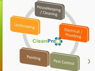 CleanPro Services Pvt. Ltd is one of Bangalore's leading integrated property services companies. They offer both contractual and customized cleaning, maintenance, and facility management services for both commercial and residential properties in Bangalore. Their services include housekeeping, landscaping, pest control, and engineering services like electrical, plumbing, and painting. They aim to provide efficient, reliable, and affordable services with transparent communication through trained and verified staff.
