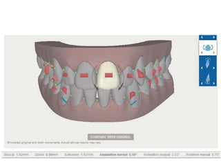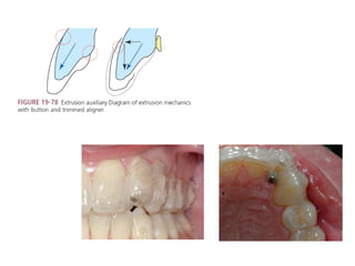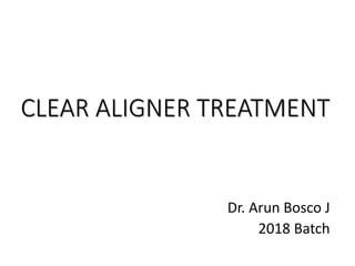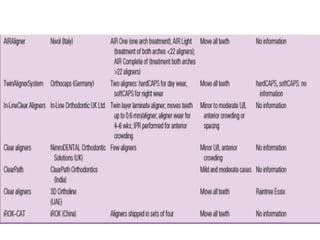 The document provides a comprehensive overview of clear aligner treatment, focusing on invisalign, including its history, techniques, indications, advantages, and limitations. It details advancements in impression techniques and digitization, emphasizing the evolution from manual methods to digital processes, and discusses the classification of aligners and their specific applications. Additionally, it addresses treatment protocols, challenges in patient compliance, and the technological innovations influencing orthodontic practices today.