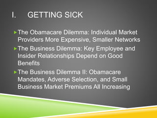 The document discusses challenges businesses face due to Obamacare, litigation, and cash flow issues, along with strategies for risk management and growth. It emphasizes the importance of self-insurance, separating assets from high-risk operations, and improving cash flow through various financial strategies. Additionally, it highlights the value of businesses as they scale and the necessity of addressing inefficiencies to enhance valuation.