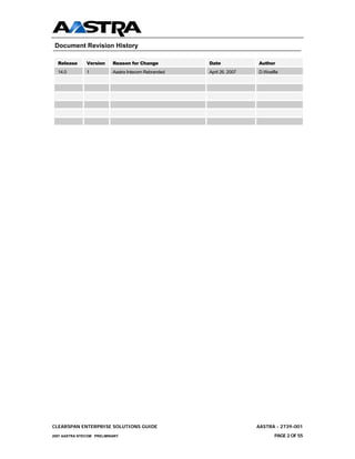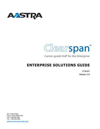The document provides an overview of the Clearspan enterprise solutions guide, which is intended to advise implementers about deploying centralized voice services architectures in enterprises. It describes Clearspan as an enhanced unified communications system allowing enterprises to offer advanced communications applications over a VoIP network. Key aspects of Clearspan covered include its scalability, support for single or multi-site deployments, use of open standards, and integrated suite of communications applications.