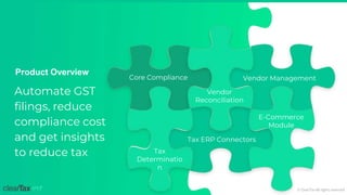 The document outlines ClearTax's solutions for GST compliance and vendor management, introducing features that automate GST filings and reconciliation processes. It highlights various functionalities like multi-GSTIN import, access control, and intelligent reporting tools to streamline tax compliance and reduce costs. Additionally, it addresses challenges faced by businesses in GST filing and reconciliation and emphasizes ClearTax's commitment to enabling seamless transition to GST 2.0.
