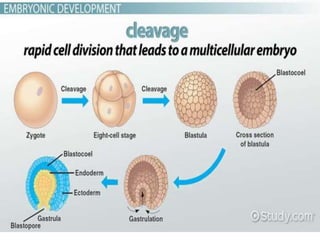This document summarizes key aspects of mammalian cleavage. It begins by defining cleavage as the rapid cell divisions that occur after fertilization. It then describes different patterns of mammalian cleavage based on cleavage furrows, fate of germ layers, and cell arrangement. The importance of cleavage in generating cells for differentiation and increasing the nucleus to cytoplasm ratio is highlighted. Key stages of early embryonic development including fertilization, cleavage, gastrulation and organogenesis are outlined. The document concludes by detailing the specific cell divisions and structures that arise during cleavage and blastula formation in mammals.