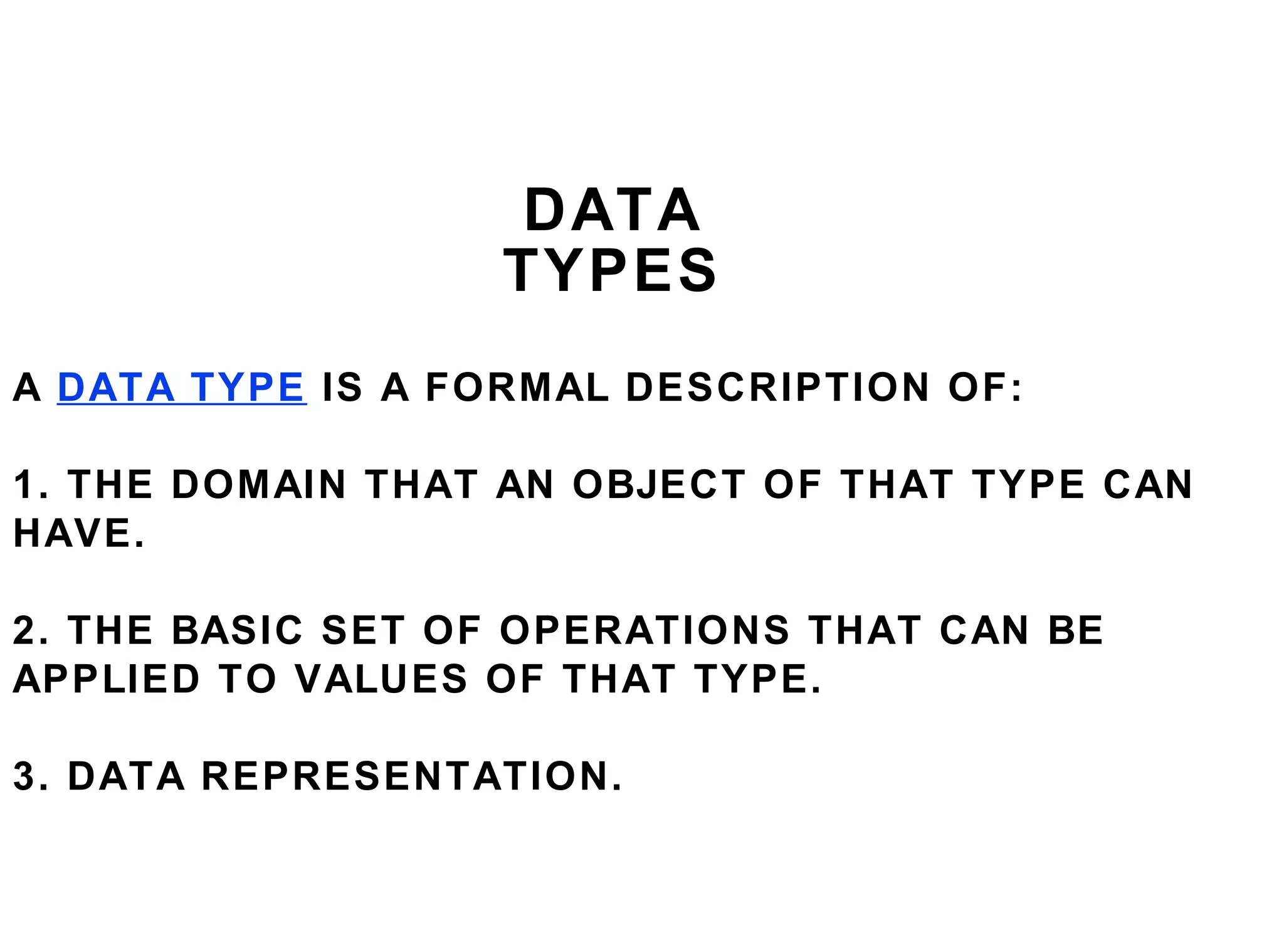 The document discusses data abstraction and user-defined data types in C++. It explains that a data type provides a formal description of the domain, operations, and representation of values. Basic types like int and char are described, as well as user-defined types using the typedef keyword or class definitions. The class allows modeling data with attributes and defining operations on the data type through member functions.