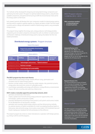 The DESY Factsheet provides information on the Distributed Energy Systems program which aims to increase renewable energy production and promote hybrid energy technologies. The program consists of research carried out by universities and institutes, joint research with companies, and demonstration projects. It focuses on developing hybrid energy solutions, business concepts, and analyzing local energy sustainability. The goal is to optimize hybrid energy systems and provide reliable tools and methods for designing such systems.
