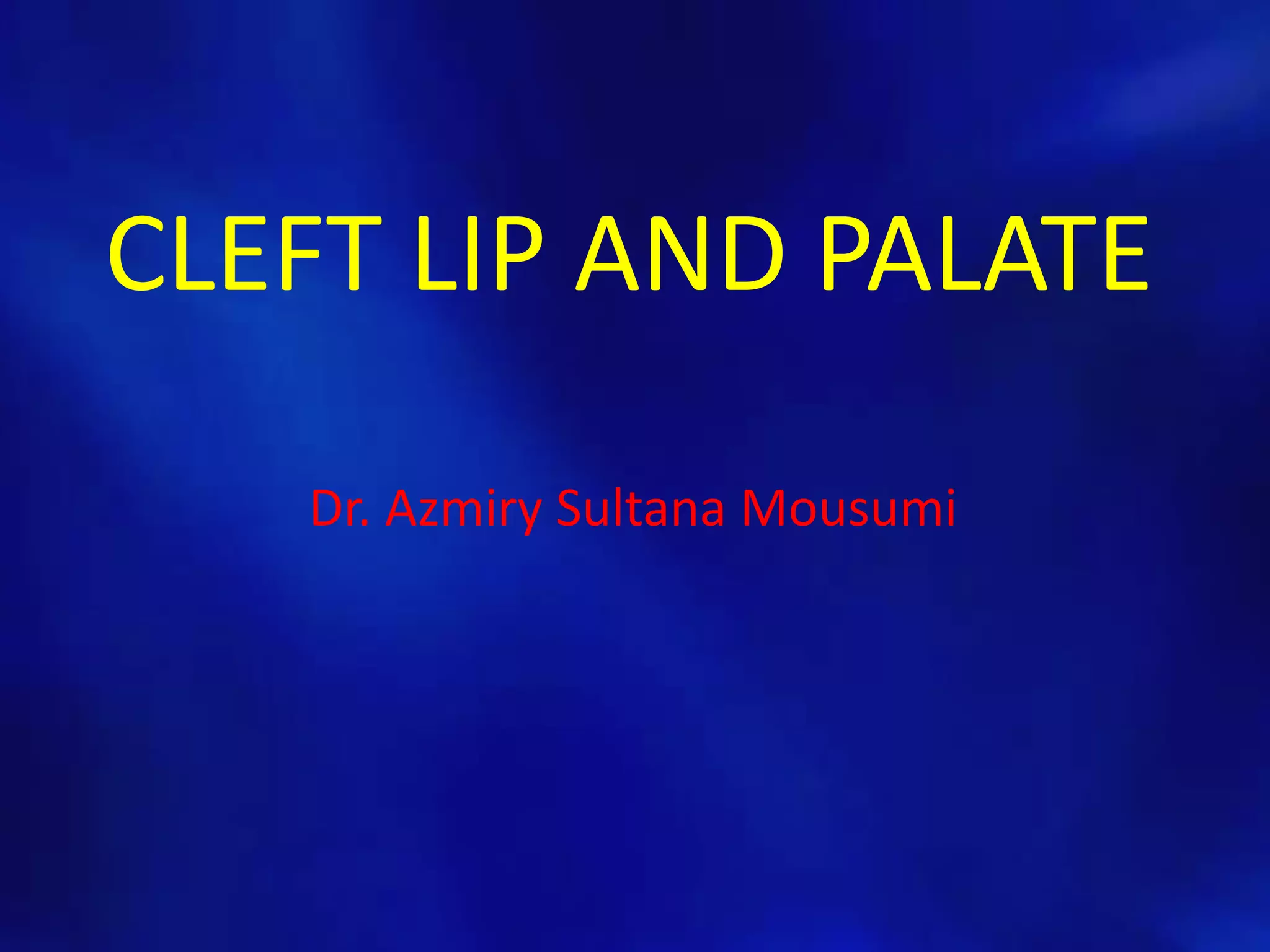 Cleft lip and palate is a birth defect where the tissue of the mouth and palate do not properly fuse together, leaving an opening in the lip and/or roof of the mouth. It affects 1 in 750 births and can cause problems with feeding, speech, dental issues, and facial growth. The document discusses the anatomy, development, causes, classification, and management of cleft lip and palate. Management involves a multi-disciplinary team and stages of surgery to repair the lip, palate, and other issues, as well as other treatments like dental appliances and bone grafts.