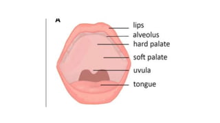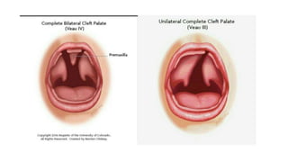 This document provides information about cleft palate, including its definition, symptoms, types, causes, risk factors, complications, treatment, and prevention. Cleft palate occurs when the tissues that form the roof of the mouth do not fuse completely during development in the womb. It can range from a small split in the soft palate to a complete opening involving both the soft and hard palates. The main treatment is surgery called palatoplasty to close the opening between the mouth and nose. Preventive measures include prenatal vitamins, avoiding tobacco and alcohol during pregnancy, and genetic counseling for families with a history of cleft palate.