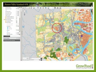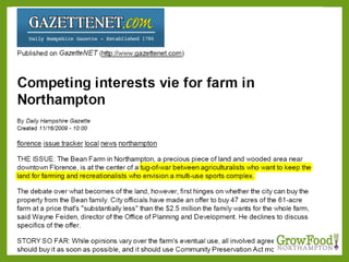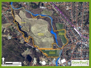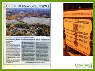 The document outlines the New England food vision's mission to enhance food security and sustainable agriculture in Northampton, Massachusetts, by addressing farmland protection, transfer, and farm viability. It highlights initiatives like community farms and gardens, food subsidies, and educational programs aimed at diverse community members. A total of $2.4 million is invested to protect 180 acres of farmland and promote local food access and education.