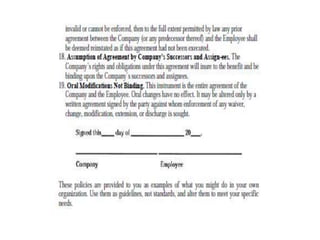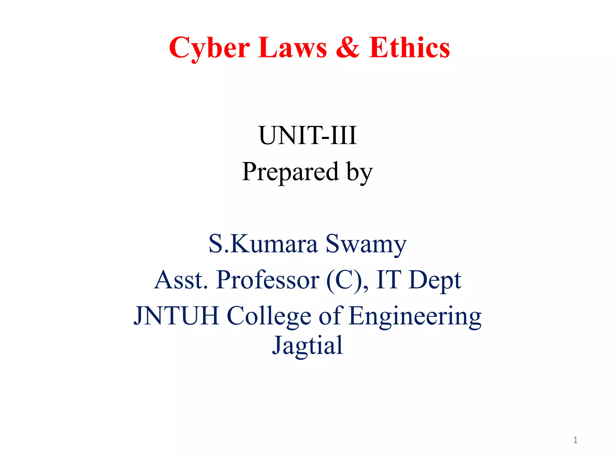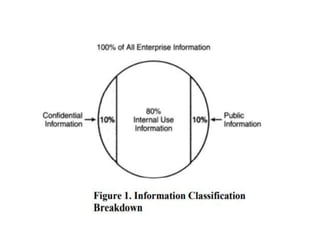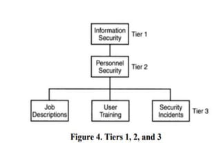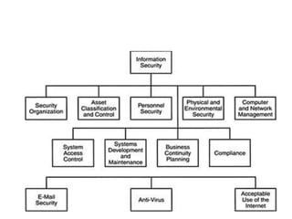This document discusses cyber laws and ethics as well as information security policies and procedures. It covers 11 tier 1 corporate policies including employment practices, standards of conduct, conflict of interest, and information security. It also discusses developing topic specific tier 2 policies for areas like electronic communications, internet security, and anti-virus. The goal of information security policies is to protect the integrity, confidentiality, and availability of information as an organizational asset.