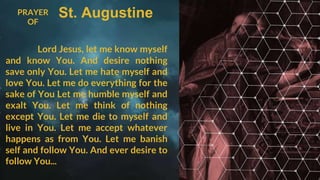 The document contains the prayer of St. Augustine asking God to help him know and love only God. It asks God to help him humble himself, think only of God, cling to nothing but God, and enjoy God forever. It also contains questions about the meaning and importance of the Ten Commandments and how following them can help one become an authentic disciple of Jesus Christ.