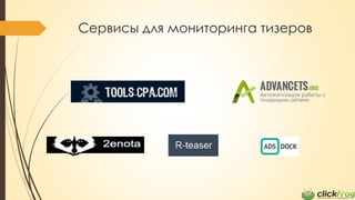 Документ охватывает проблемы мошенничества с кликами и способы анализа тизерного трафика с помощью сервиса clickfrog.ru. В нем представлена информация о методах аудита трафика, включая фильтрацию источников и анализ поведения пользователей на сайте. Показаны статистические данные по затратам, кликам и уникальным пользователям, а также результаты мониторинга фрода в рунете.