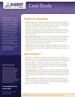 Puppet helped Clickability dramatically increase their speed of deployment and ensure consistency across all servers. Puppet allowed Clickability to build out new servers within minutes rather than days and make system-wide changes rapidly. This helped Clickability improve reliability, scalability, and their ability to support hundreds of customer websites. Puppet provided Clickability with a standardized, automated way to configure their infrastructure that reduced errors and improved troubleshooting.