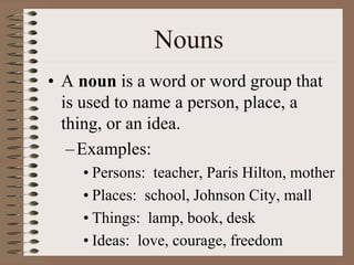 This document provides information about different types of nouns, including proper vs. common nouns, singular vs. plural nouns, concrete vs. abstract nouns, and collective nouns. It discusses the basic rules for forming plural nouns, such as adding 's' or 'es', as well as some irregular plural forms. Examples are given for each noun type and rule to illustrate their usage.