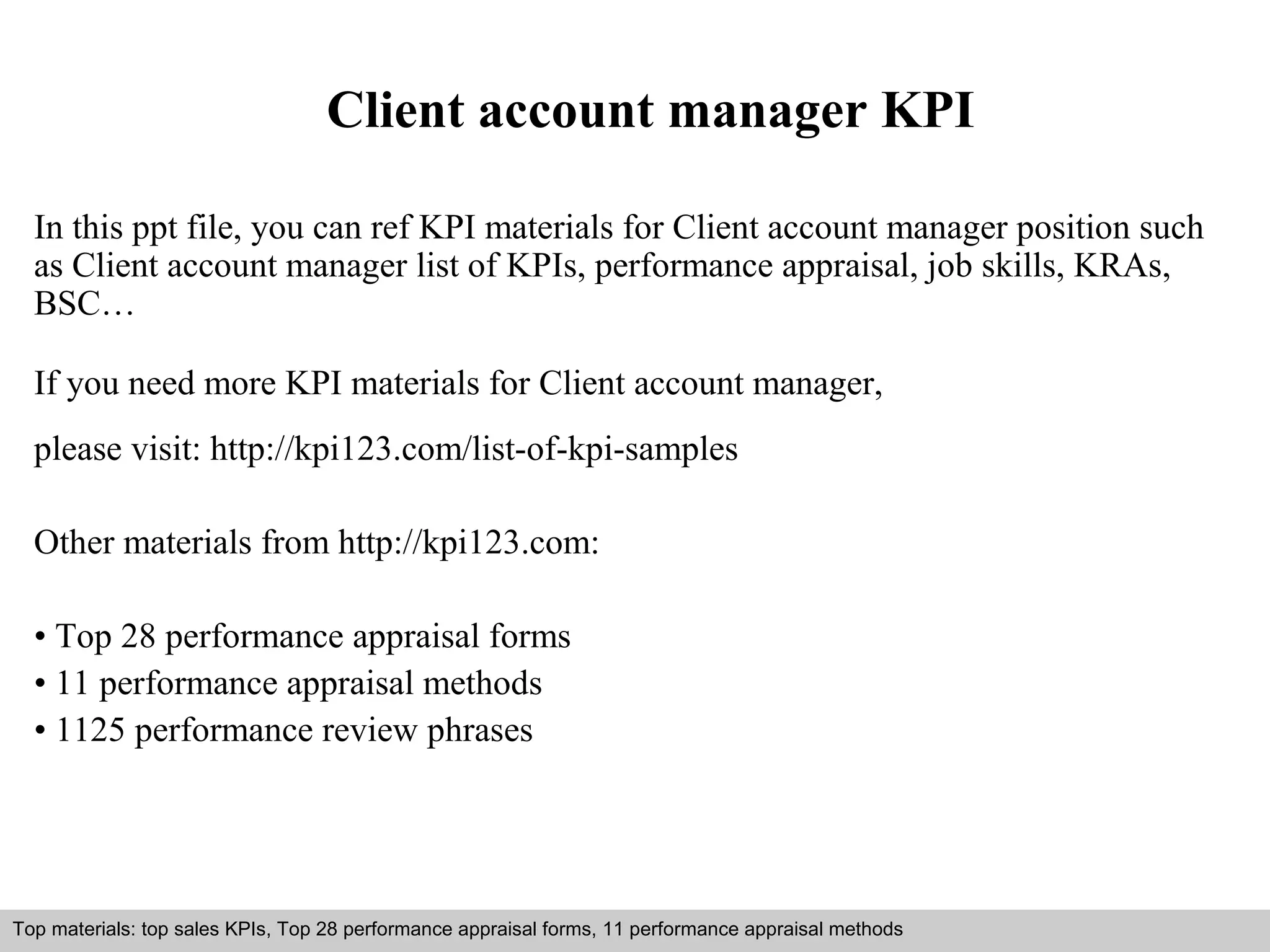 This document discusses key performance indicators (KPIs) for a client account manager position. It provides information on developing KPIs, including defining objectives and key result areas, identifying tasks, and determining how to measure results. The document recommends that KPIs be clearly linked to strategy and empower employees. It also lists types of KPIs and directs the reader to a website for additional KPI samples and materials.