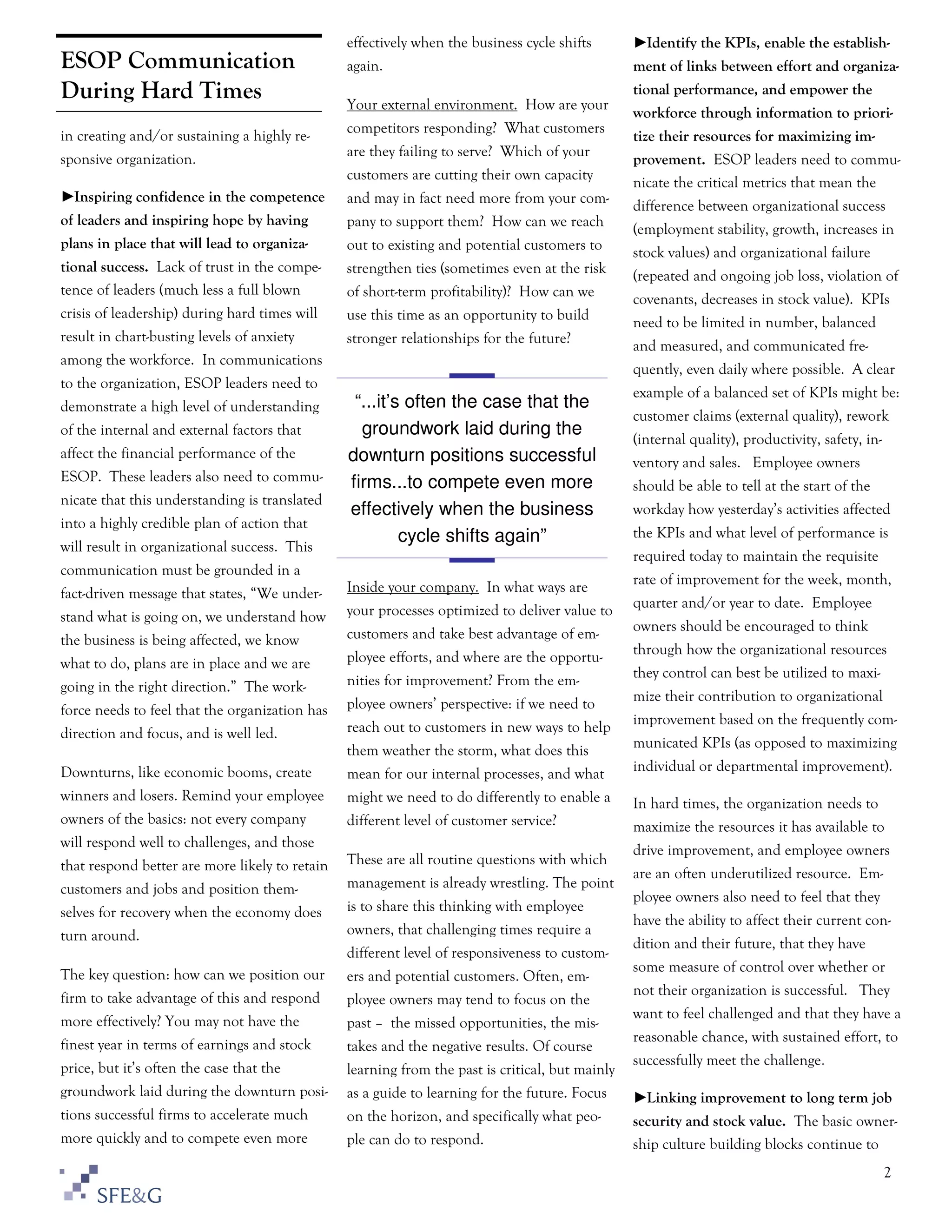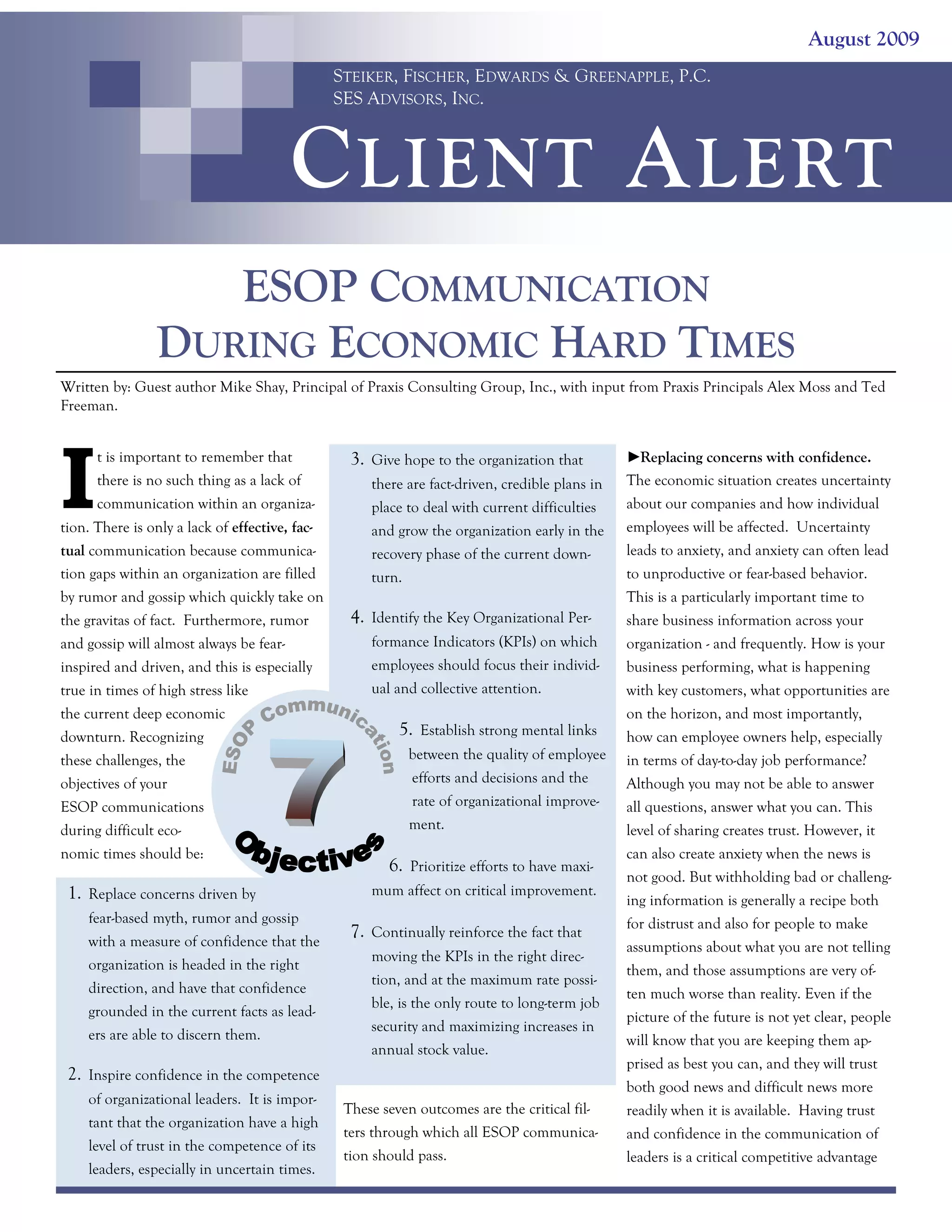 The document discusses the importance of effective ESOP communication during economic hardships, emphasizing the need for organizations to replace fear-driven rumors with factual information to inspire confidence among employees. It recommends identifying key organizational performance indicators and maintaining transparency in communications to build trust in leadership. Additionally, it outlines adjustments in required minimum distributions for 2009 as per the Worker, Retiree, and Employer Recovery Act and provides options for plan sponsors regarding how to handle distributions.