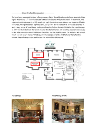 The client has requested a contemporary dance show over two nights at Arley Hall Gardens with a maximum audience of 100 people per night. The dance show, called Amalgamation, will feature work by A-Level dance students from Priestley College and highlight the beauty of Arley Hall itself. Performances will take place simultaneously in two adjacent rooms, the Gallery and Drawing Room, with the audience split between the rooms and switching at intermission to see both parts of the show.