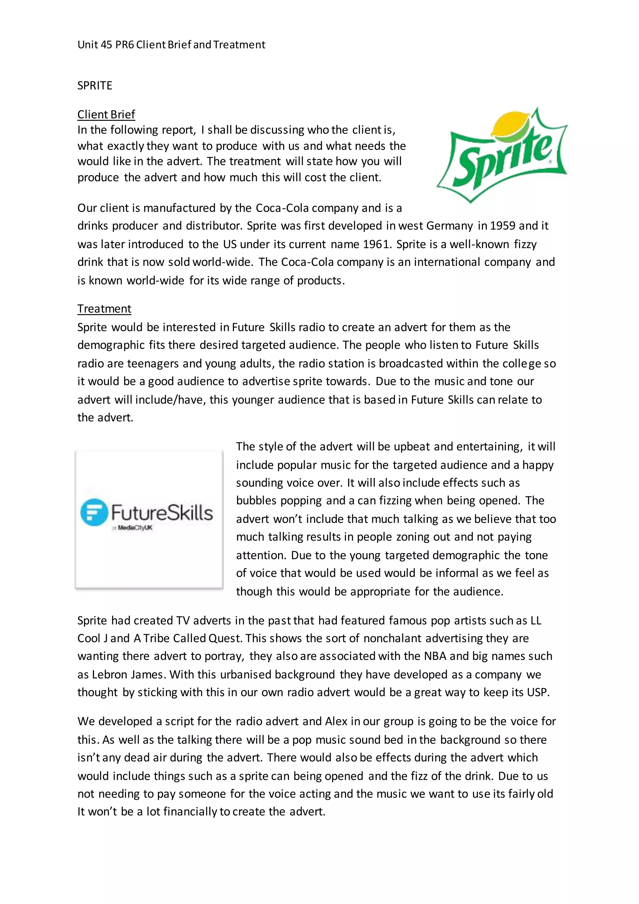 Sprite is a well-known fizzy drink produced and distributed by Coca-Cola. They are interested in creating a radio advertisement targeted at teenagers and young adults listening to Future Skills Radio, a college radio station. The proposed advertisement would have an upbeat style with popular music, fizzy drink sound effects, and an informal voiceover to appeal to the young demographic. It would portray Sprite's urban image through music without long spoken sections that could lose listeners' attention. The advertisement could be created and voiced by the media students themselves at low financial cost to Sprite.