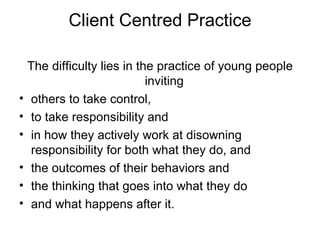 The document discusses the importance of client-centered practice when working with youth. It emphasizes that the client is the expert on themselves and the worker's role is to hand over responsibility for answers and thinking to the client through questioning. A client-centered approach requires workers to consistently invite responsibility from clients by asking questions about their thinking, intentions, and how they arrived at decisions. It should be respectful, engaging, and provide new information while addressing power imbalances, rather than arguing, blaming, or deciding outcomes for clients.