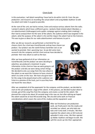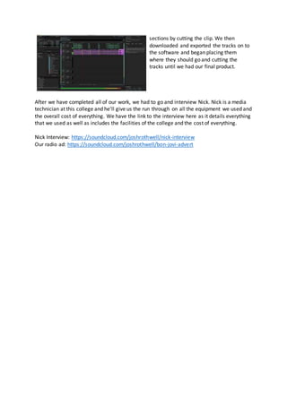 The document details the process of creating a radio advertisement for the band Bon Jovi to promote their upcoming tour and new album. It discusses analyzing existing advertisements, conducting research on the band and client Island Records, drafting a treatment, planning the script, recording the advertisement in the studio, and editing the audio using Adobe Audition. The final advertisement is 20 seconds in length and includes song previews from the new album to promote interest in the tour.