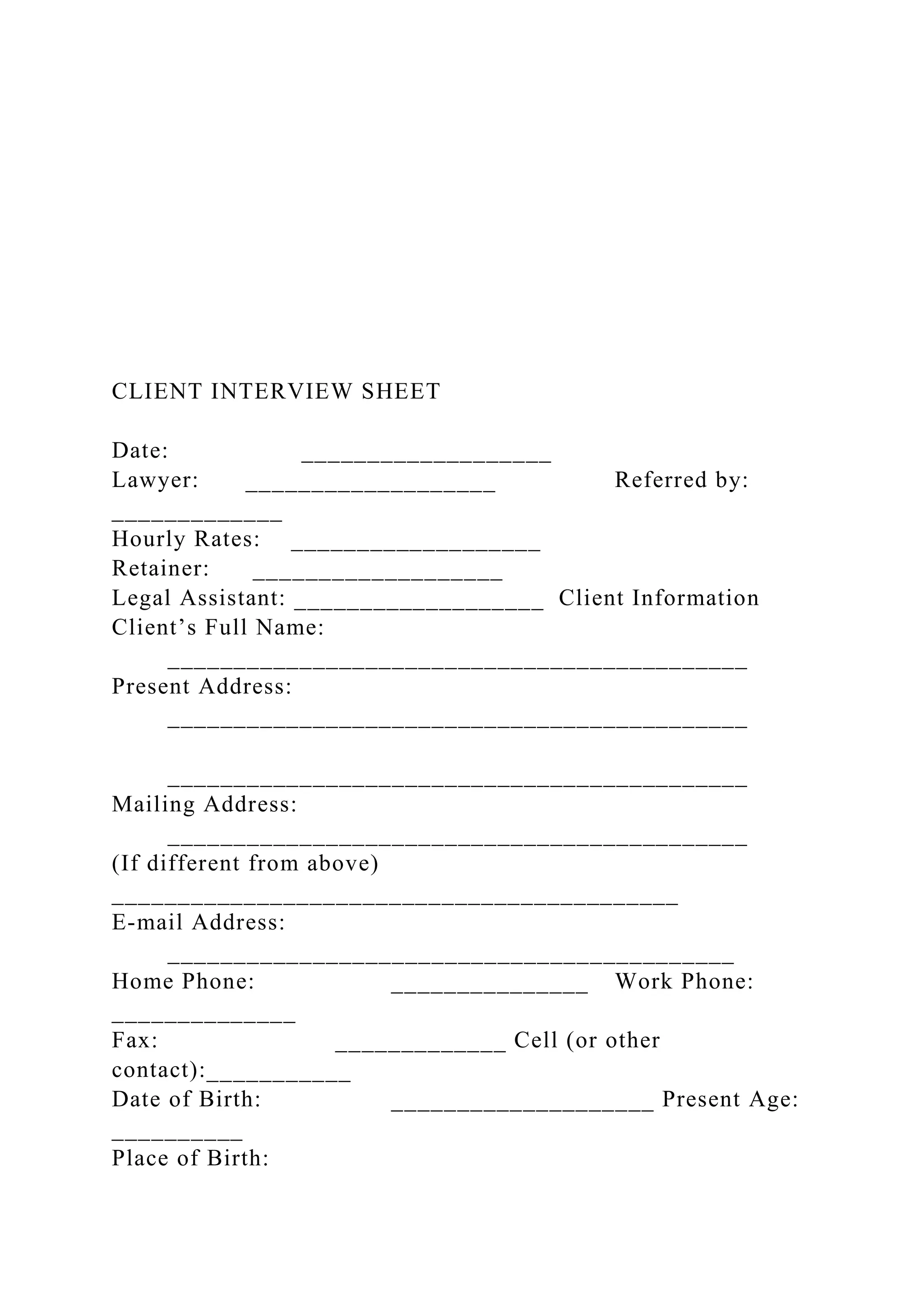 This document is a client interview sheet used by lawyers to collect detailed personal and financial information from clients seeking legal assistance. It includes sections for client and spouse demographics, assets, debts, income, children details, and questions about legal wills and insurance. The form is designed to facilitate discussions around family law matters and the client's legal needs.