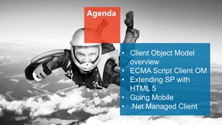 The document discusses the SharePoint client object model (COM) which allows remote access and manipulation of SharePoint data from client applications. It covers the three flavors of client OM: ECMA Script, .NET managed, and HTML5/mobile. Key points include batch processing for performance, integration with line of business applications, simplifying the user interface with client-side programming, enabling HTML5 features, and using jQuery for mobile development. Limitations include inability to access certain features like search and profiles, and throttling of requests to the server.
