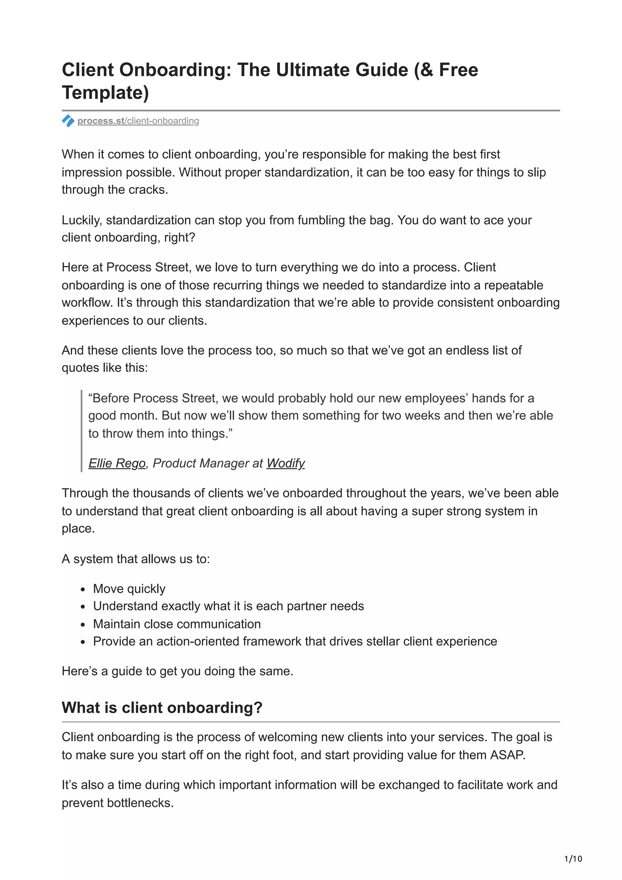 This document serves as a comprehensive guide to client onboarding, emphasizing the importance of a standardized onboarding process to ensure a positive client experience and drive long-term satisfaction. It outlines key steps for successful onboarding, such as assessing client needs, setting goals, and maintaining communication, while also highlighting best practices like automating processes and encouraging feedback. Ultimately, the guide suggests that effective onboarding can significantly enhance client retention and generate referrals, making it a critical component of business strategy.