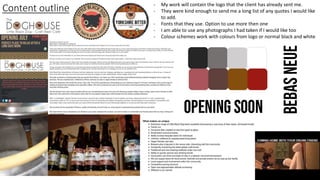 The client provided their logo, quotes, and fonts to use in the design work. Photographs may also be included. The target audience is adults ages 18-middle aged for a venue open from noon to 9pm. Resources needed are a computer, Photoshop, and camera. Only the designer is required and no budget is needed as the client is nearby. The schedule includes designing poster concepts in the first week and finalizing the poster size and photos in the second week.