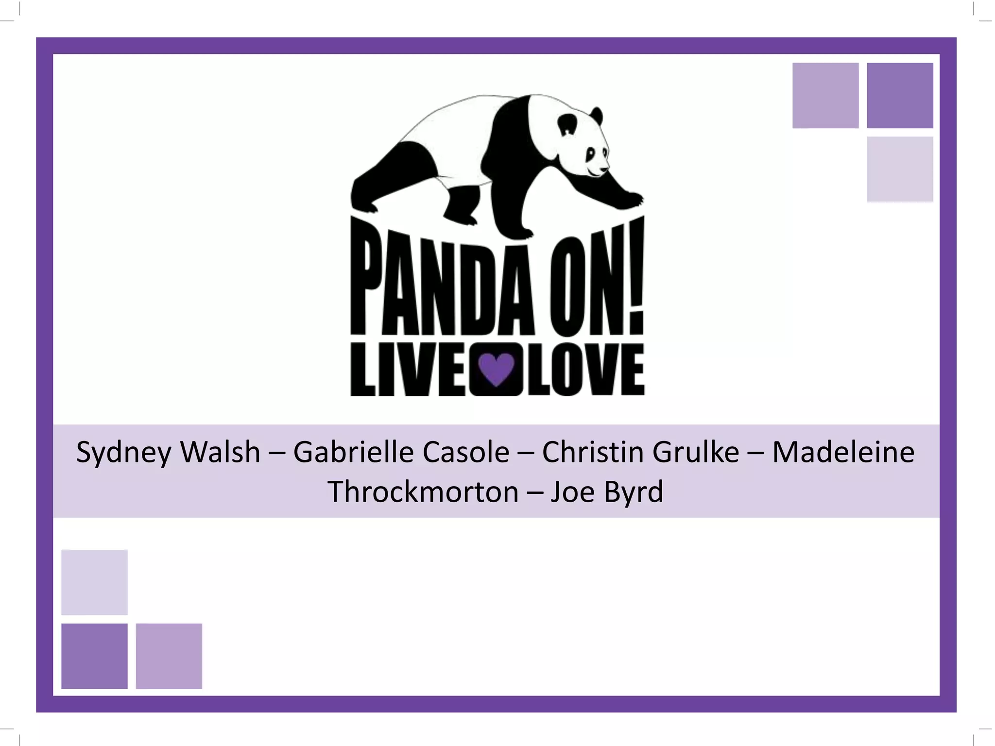 The document provides a background on Panda On!, a family-owned business that sends messages of encouragement through environmentally friendly products. It outlines research conducted on the company's lack of differentiation, consumer preferences, and target audiences. The goals, objectives, strategies and tactics presented focus on increasing awareness of Panda On! through an improved online presence and community events targeting Baby Boomers and Millennials. Sample media pieces like the updated website, social media posts, and business cards are included to showcase how the recommendations could be implemented.