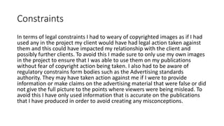 The document summarizes the client's project to design a logo and business cards. It discusses managing constraints like copyright and regulations. It also covers managing the project through planning, equipment, and communication. Time management was achieved through splitting the 5 week timeline into phases and creating a production schedule. Feedback from the client was positive regarding meeting requirements for the logo and business card designs.