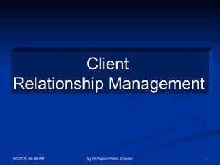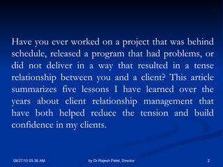 The document provides five lessons for effective client relationship management: 1) Call clients when problems arise to discuss solutions and timelines; 2) Keep clients informed of issues even if they are unaware; 3) Have solutions ready to offer clients rather than waiting for them; 4) Underpromise and overdeliver to build trust; 5) Add value by proactively offering clients suggestions to improve their business.