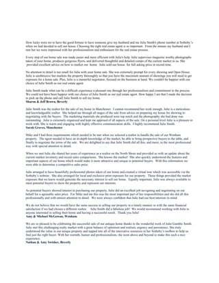 Julie Smith is highly recommended by multiple clients as an excellent realtor with extensive experience on the North Shore. She sold homes quickly and for high prices, including one in less than a week in the slow winter season. Clients praise her professionalism, knowledge of the local market, attentiveness, creative marketing strategies, and ability to navigate negotiations skillfully on their behalf. She made the process of both buying and selling homes an easy and pleasant experience.