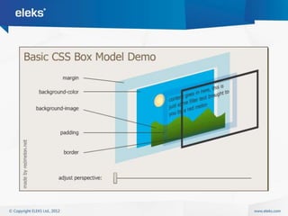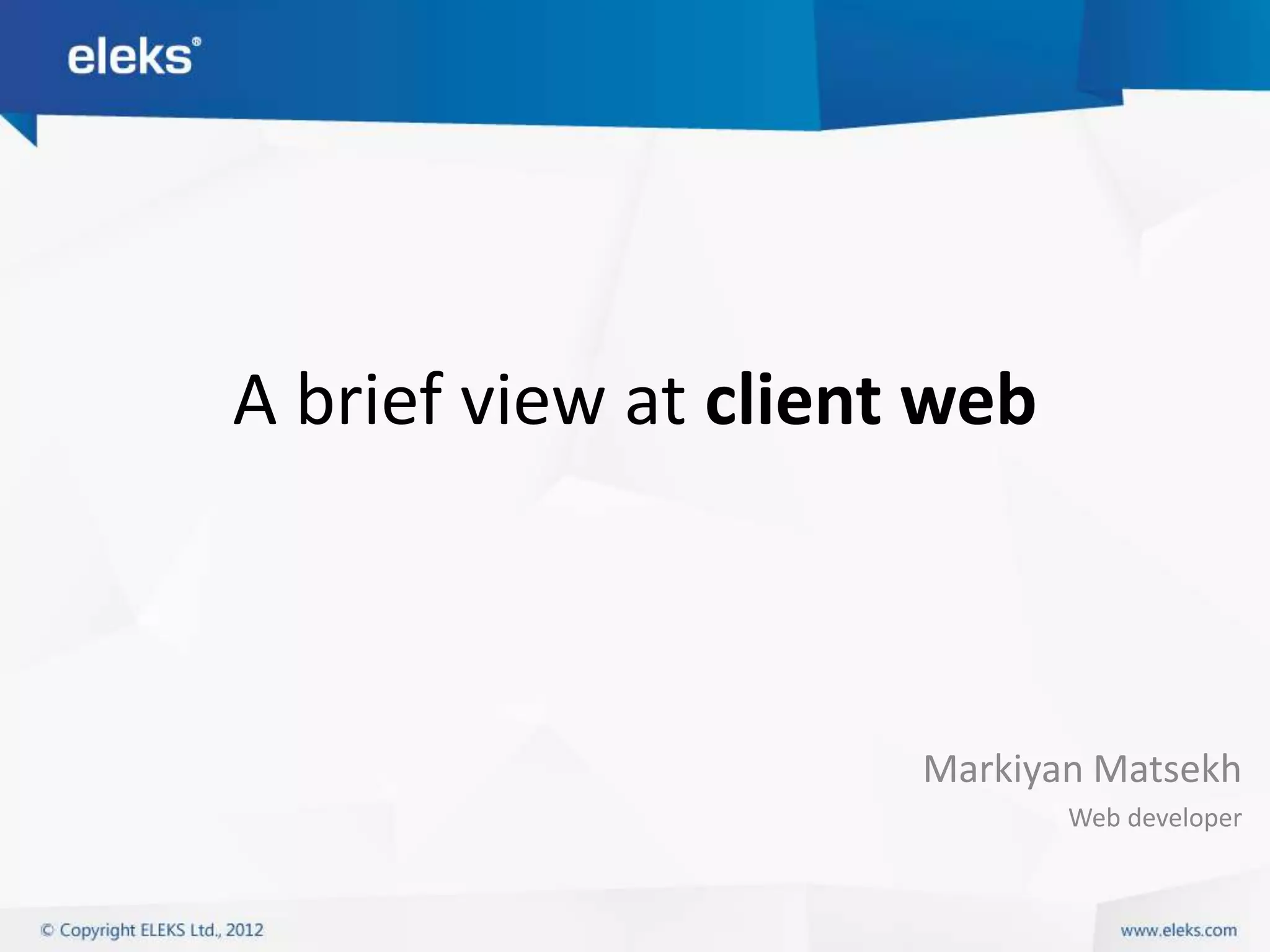 The document provides an overview of core web technologies including HTTP, HTML, CSS, JavaScript and how they work together. It explains how HTTP is used to transfer data between client and server, how HTML structures content, CSS styles content, and JavaScript controls behavior. It also discusses how these technologies have evolved over time and how jQuery simplifies working with them through its selector and method chains that abstract browser differences.