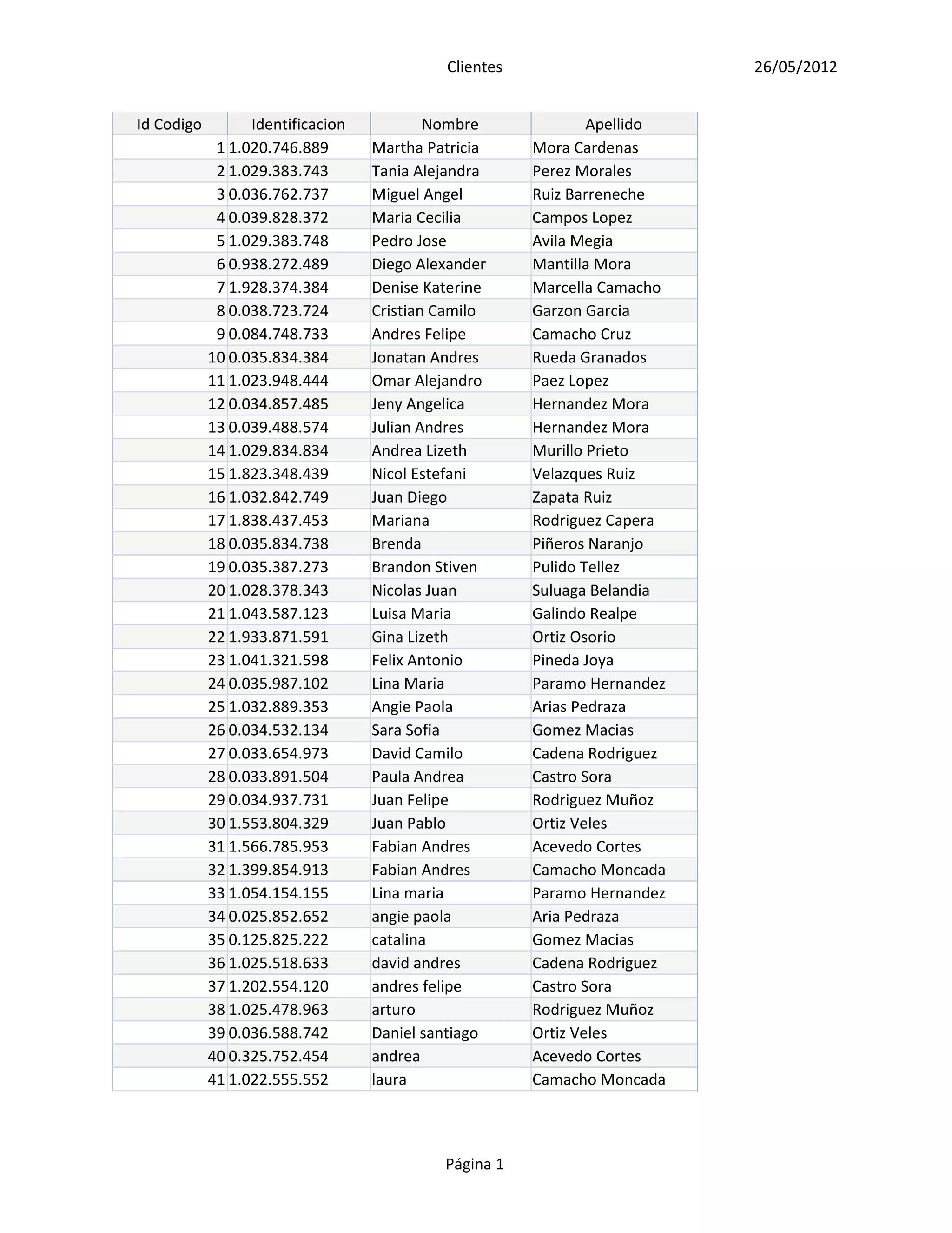 The document contains a list of 41 clients with their identification details like ID number, name, age, sex, address, phone number, city. The clients are from various cities in Latin America like Mexico, Lima, Santiago, Buenos Aires, Bogota, Montevideo, Brasilia, Caracas, Panama, Quito. The list provides the basic information about each client in a structured table format.