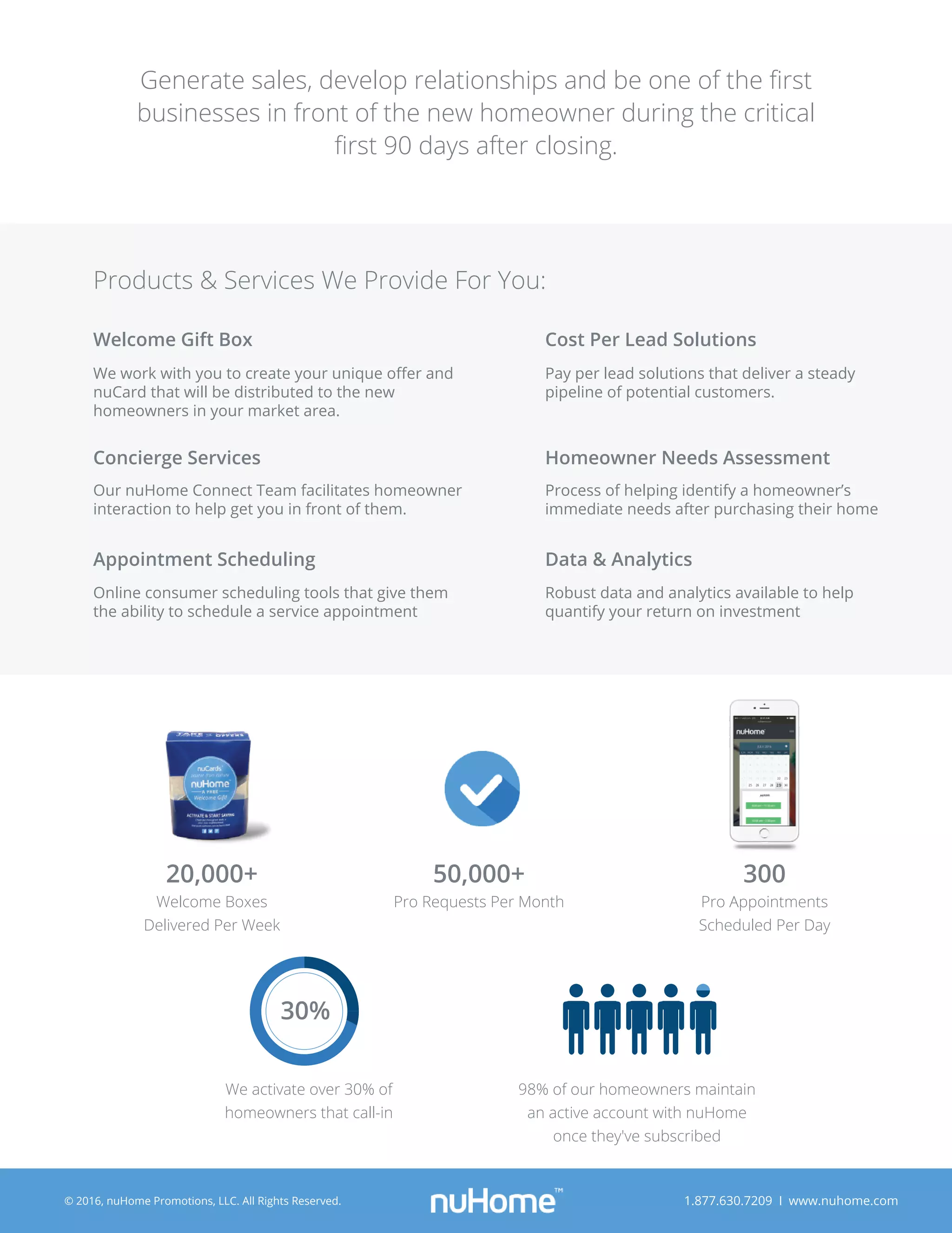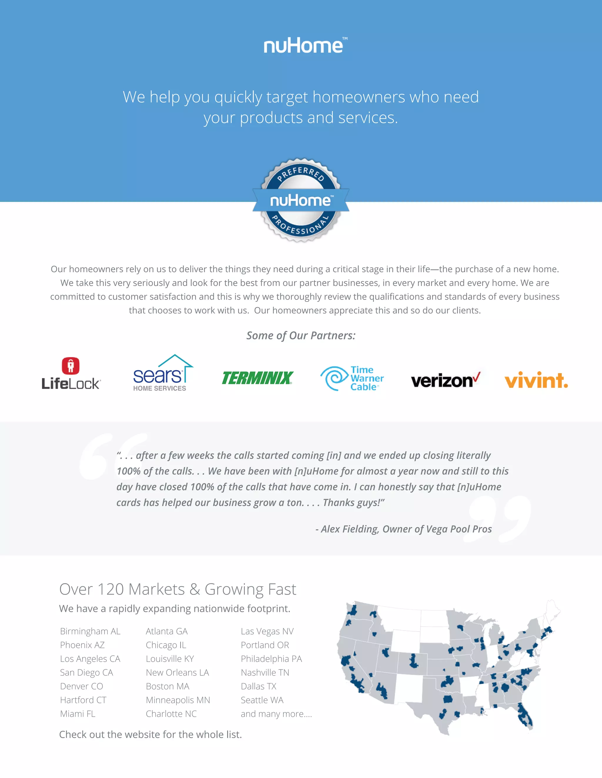 NuHome works with partner businesses to provide products and services to homeowners during a critical time when purchasing a new home. They thoroughly review partner qualifications to ensure high standards and customer satisfaction. One of their pool service partners reported generating 100% of calls from NuHome cards and experiencing significant business growth over the past year working with NuHome. NuHome has a rapidly expanding nationwide network in over 120 markets to connect homeowners and partners.